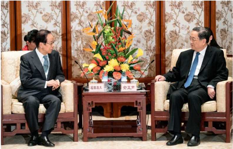 2015年,俞正声同志会见来华参加由中国外文局和日本言论NPO共同主办的“北京—东京论坛”的日本前首相福田康夫一行