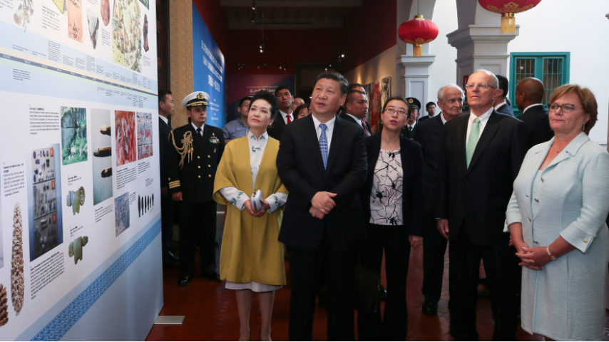 2016年11月21日,中国国家主席习近平和秘鲁总统库琴斯基共同参观中国外文局在秘鲁利马举办的《文明的长河—中拉文明互鉴》图片展