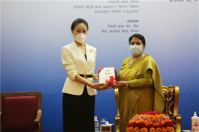 侯艳琪代表中方向班达里总统赠送《习近平谈治国理政》第二卷尼泊尔文版和第三卷英文版