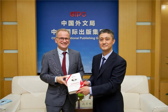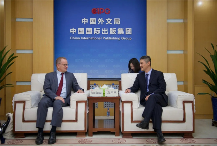 高岸明向达瑟一行到访中国外文局表示欢迎,并介绍了外文局在出版发行、国际传播、高端外宣、人文交流等方面的情况。他表示,外文局作为综合性专业国际传播机构,以讲好中国故事、向世界说明中国作为使命,愿与法国维旺迪集团加强交流,共同推进中法及中欧人文交流、文明互鉴与民心相通。