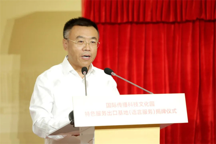 9月28日,中国外文局在国际传播大厦举行国际传播科技文化园特色服务出口基地(语言服务)揭牌仪式。局长杜占元出席并讲话,副局长陆彩荣、高岸明、于涛出席。副局长刘大为主持揭牌仪式。局属各单位、机关各部室主要负责同志及属地、园区部分企业代表参加。