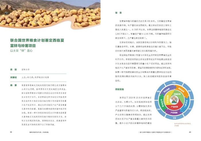 联合国世界粮食计划署定西临夏富锌马铃薯项目是本书收录的案例之一。联合国世界粮食计划署驻华代表屈四喜表示,世界粮食计划署是中国农业农村发展和脱贫攻坚事业的参与者、贡献者和见证者。我们愿与甘肃省加强合作,共同探索实现农业农村可持续发展的创新途径,并将甘肃乃至中国的成功经验和适用技术分享给其他发展中国家,帮助他们提升粮食安全和营养水平。