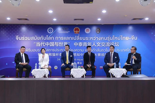 当地时间4月24日,“当代中国与世界”中泰青年人文交流论坛在泰国曼谷举行。论坛由中国外文局所属当代中国与世界研究院、中国外文局亚太传播中心(人民中国杂志社、中国报道杂志社)、泰中“一带一路”研究中心主办,中国外文局亚太传播中心曼谷分社承办,泰中文化促进委员会、泰国国家研究院泰中战略研究中心、泰国庄甲盛皇家大学、亚洲领袖通讯社、今日曼谷报社(Bangkok Today)协办,本次论坛以“共建‘一带一路’的中泰青年责任与使命”为主题,是“熊猫杯”泰国青年感知中国系列活动的项目之一。