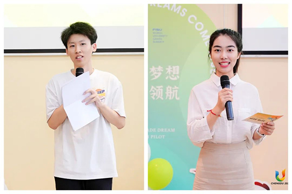 现场的两位大运会志愿者代表,来自电子科技大学的陈书林、贺梦凡分享了他们作为志愿者的心路历程以及与大运会的不解之缘。参与大运会志愿服务的工作让他们亲身体会到“敢于筑梦,不懈追梦,终将圆梦”的经历,更深刻地感受到“成都成就梦想”所承载的情感。他们表示,“已经做好了充分准备,并将持续准备着,为向世界呈现一届具有中国特色、彰显时代风采、展现巴蜀韵味的体育盛会而不懈努力”。