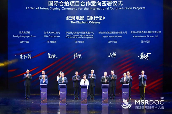 在开幕式上,加拿大IMAX公司、柬埔寨国家电视台、新加坡海滩别墅影业有限公司、新加坡IFA MEDIA制作公司、美国国家地理频道、埃及国家电视台签约代表分别和中国外文局所属中国对外书刊出版发行中心(国际传播发展中心)、福建省广播影视集团、广西广播电视台等机构签署了纪录电影《象行记》和纪录片《跨越时空的北京中轴线》《海丝双城记》《永恒的朋友》《田野之上》(国际版)等五部国际合拍影视项目意向合作协议,主题涵盖中国文化、经济、生态等多个领域。