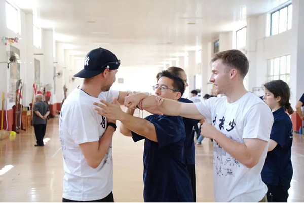 在练功房,教练们进行了精彩的表演。在太极和螳螂拳的展示中,每个动作都充满了柔和而均衡的力量,教练独特的身法和流畅的动作让外籍青年们赞叹不已。咏春拳快速连贯的技法以及精准的拳脚配合,每个招式都流畅有力,凝聚着咏春拳特有的爆发力和实用性。在交流中外籍青年了解到,传统武术精神是儒家思想的体现,也是自强不息的民族精神的体现?!罢庹娴奶崃耍∥乙菔?!”来自智利的新闻编辑大卫在观赏完表演后激动地说道。