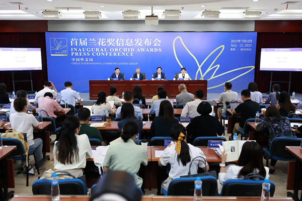 7月12日,首届兰花奖信息发布会在北京举行。中国外文局副局长、首届兰花奖评委会副主任委员陆彩荣,中国美术家协会主席、首届兰花奖评委会副主任委员范迪安,中国外文局副总编辑、兰花奖秘书处秘书长陈实出席发布会,正式公布首届兰花奖入围名单,发布兰花奖标识,通报评选表彰工作整体情况,并回答中外记者提问。中国外文局综合业务部主任、兰花奖秘书处副秘书长辛峰主持发布会。