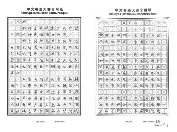 硬笔组一等奖作品选,获奖者分别为别兹列普金娜?阿纳斯塔西娅(俄罗斯)、王菲(阿根廷)