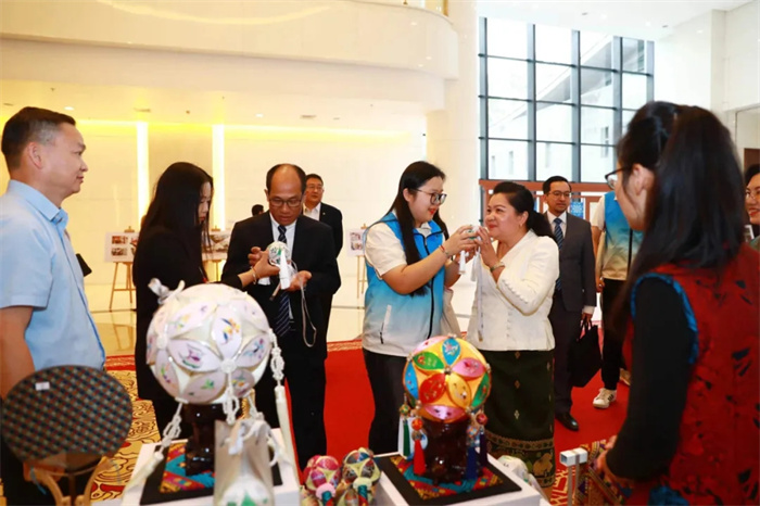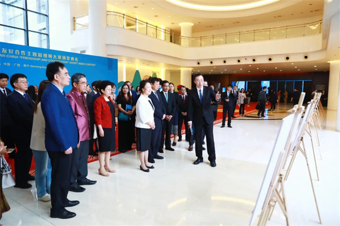 活动前,与会领导嘉宾参观第四届中国—东盟友好合作主题短视频大赛优秀作品图片展及非遗展