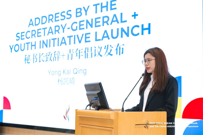 中国—东盟青年代表杨凯晴致辞并发出青年倡议。她回顾了中国—东盟青年风汇的发展历程,强调青年拥有塑造社会未来和推动切实变革的巨大力量,并代表青年们表达对中国—东盟的共同愿景:中国—东盟青年将在多元中寻求共鸣、促进地区对话与合作、在地区事务和政策制定中发出声音、为文化交流和文明互鉴作出贡献。