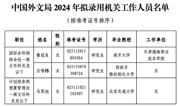 根据中央机关及其直属机构2024年度考试录用公务员工作有关要求,经过笔试、面试、体检、考察等程序,拟录用鲁冠良等3名同志为我局机关工作人员,现予以公示。公示期间,如有问题,请向我局人事部反映。