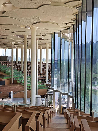 随后,外籍专家们来到北京城市图书馆。这座巨大银杏叶造型的建筑,每一处细节都凝聚着设计师的匠心,其空间布局既展现了中国传统文化的韵味,又体现了现代人性化的设计理念。大面积的玻璃幕墙不仅引入自然光,更将森林与运河的美景融入图书馆内,为读者营造了一个宁静舒适的阅读环境。在参观过程中,外籍专家们还与图书馆的“智能管家”进行了互动体验,感受到了科技在日常生活中的应用与魅力。