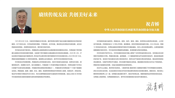 祝青桥在序言中表示,《美丽中国美丽巴西》画册集中展现了中巴两国的壮美景观、多彩文化和社会风情,生动呈现双方务实合作的丰硕成果和民间交往的精彩瞬间。展望未来,我们衷心期待同巴西各界人士一道,在两国元首战略引领下,继往开来再出发,朝着构建命运共同体的目标迈进,为两国人民谋幸福,为两国发展添动力,使中巴关系继续阔步走在时代潮流前沿。