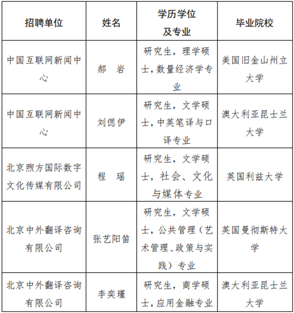 根据公开招聘工作有关规定,现将我局所属中国互联网新闻中心、北京煦方国际数字文化传媒有限公司、北京中外翻译咨询有限公司接收海外留学生予以公示。公示期间,如有问题,请向我局反映。