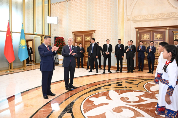 当地时间6月16日中午,国家主席习近平乘专机抵达阿斯塔纳,应哈萨克斯坦共和国总统托卡耶夫邀请,出席第二届中国—中亚峰会。这是在机场贵宾楼内,两国元首共同欣赏哈萨克斯坦少年儿童的文艺表演。(新华社记者 谢环驰 摄)