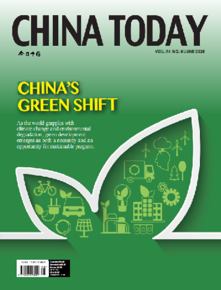 《今日中国》(英文)第6期封面报道,聚焦中国的生态文明建设和高质量发展,通过案例故事侧面展现了中国如何从一味追求GDP增长的模式向注重效率、消费者福利与保护、气候变化减缓,以及环境?;さ哪J阶洌泄庸ひ滴拿飨蛏拿鞯淖涂倭艘惶踔泄厣牡缆?。