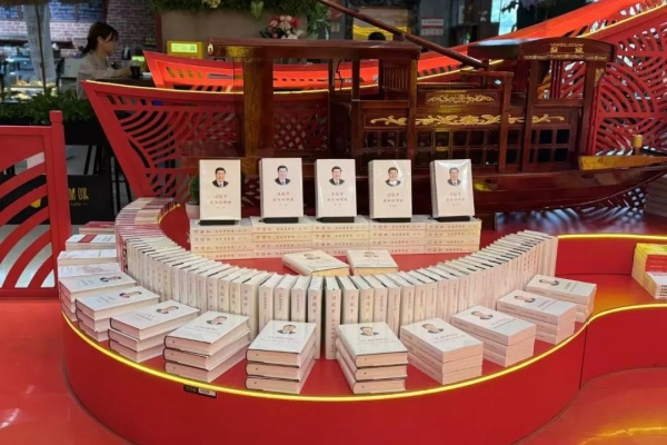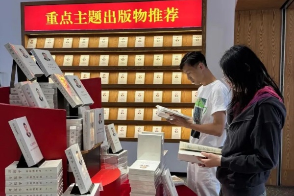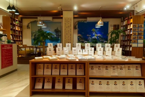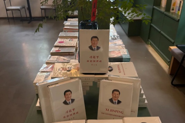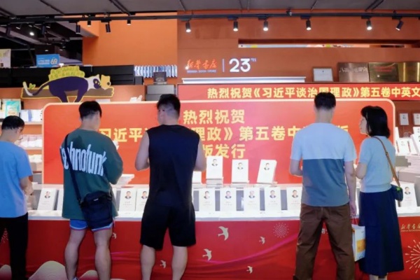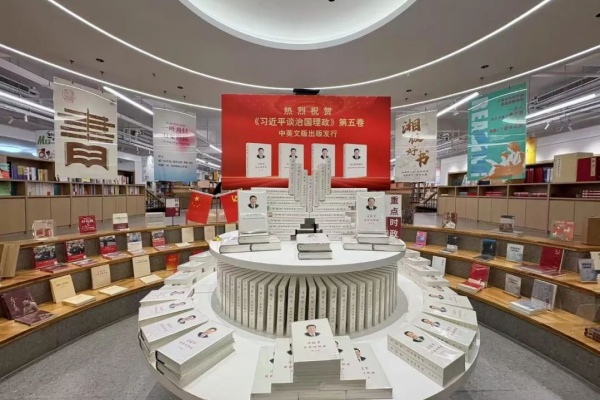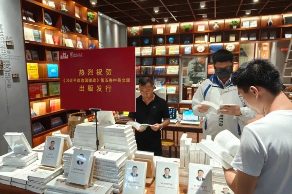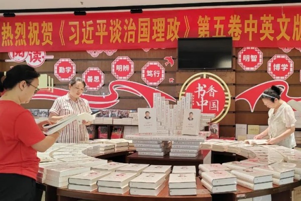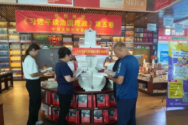 以下为《习近平谈治国理政》第五卷中英文版图书在湖南、海南、上海、天津、重庆、山东、广西、云南、新疆主要书店上架销售及读者阅读的场面。