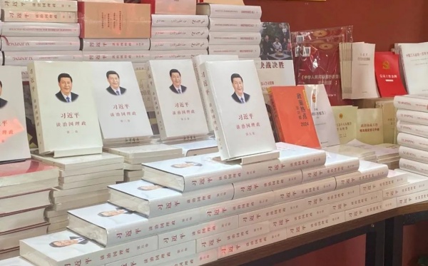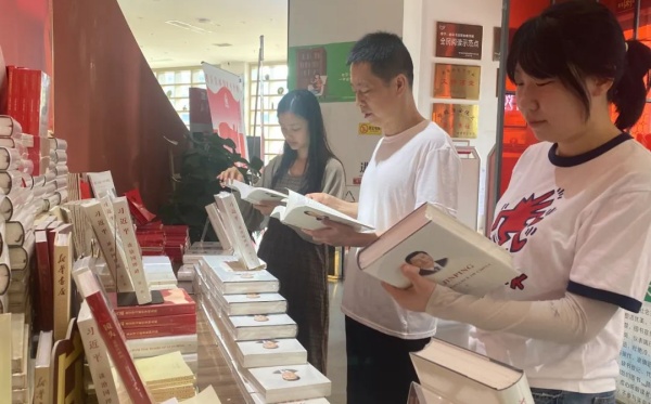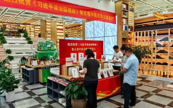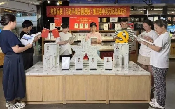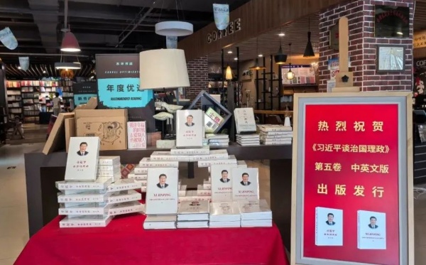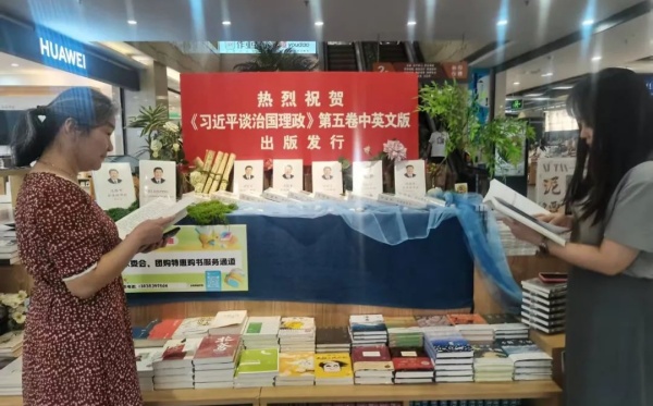 以下为《习近平谈治国理政》第五卷中英文版图书在江苏、安徽、湖北、河南、河北、山西、江西、贵州主要书店上架销售及读者阅读的场面。