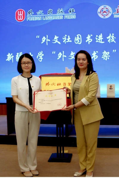 活动上,与会领导嘉宾共同为“外文社书架”揭牌,新疆大学向外文出版社赠送了“捐赠证书”。