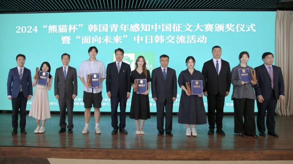 颁奖嘉宾为2024“熊猫杯”韩国青年感知中国征文大赛特等奖获奖青年颁奖