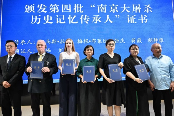 此次活动还宣布了第四批“南京大屠杀历史记忆传承人”名单,包括托马斯·拉贝和梅根·布莱迪在内的6位国际友人和“南京安全区”工作人员、幸存者以及历史证物守护者的后代在列。周峰和南京大屠杀幸存者刘民生为他们颁发证书。