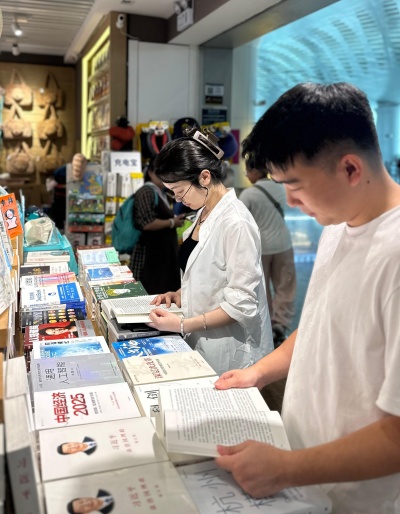 以下为《习近平谈治国理政》第五卷中英文版图书在各大机场、高铁站书店上架销售及读者阅读的场面。