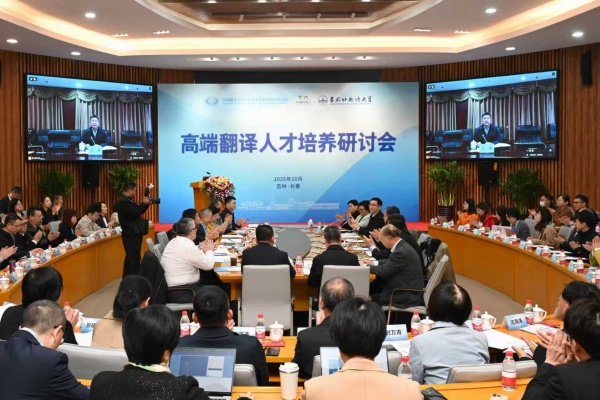 10月13日,2025年高端翻译人才培养研讨会在吉林外国语大学召开。中国外文局副局长、全国翻译专业学位研究生教育指导委员会(以下简称“全国翻译教指委”)主任委员于涛视频致辞。教育部学位管理与研究生教育司原一级巡视员唐继卫、吉林省教育厅一级巡视员刘学军出席会议并致辞。