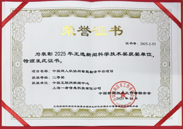 10月31日,中国新闻技术工作者联合会2025年学术年会暨王选新闻科学技术奖颁奖大会在四川成都举行,中国网申报的“人机协同智能翻译平台”项目荣获王选新闻科学技术奖(项目奖)二等奖。